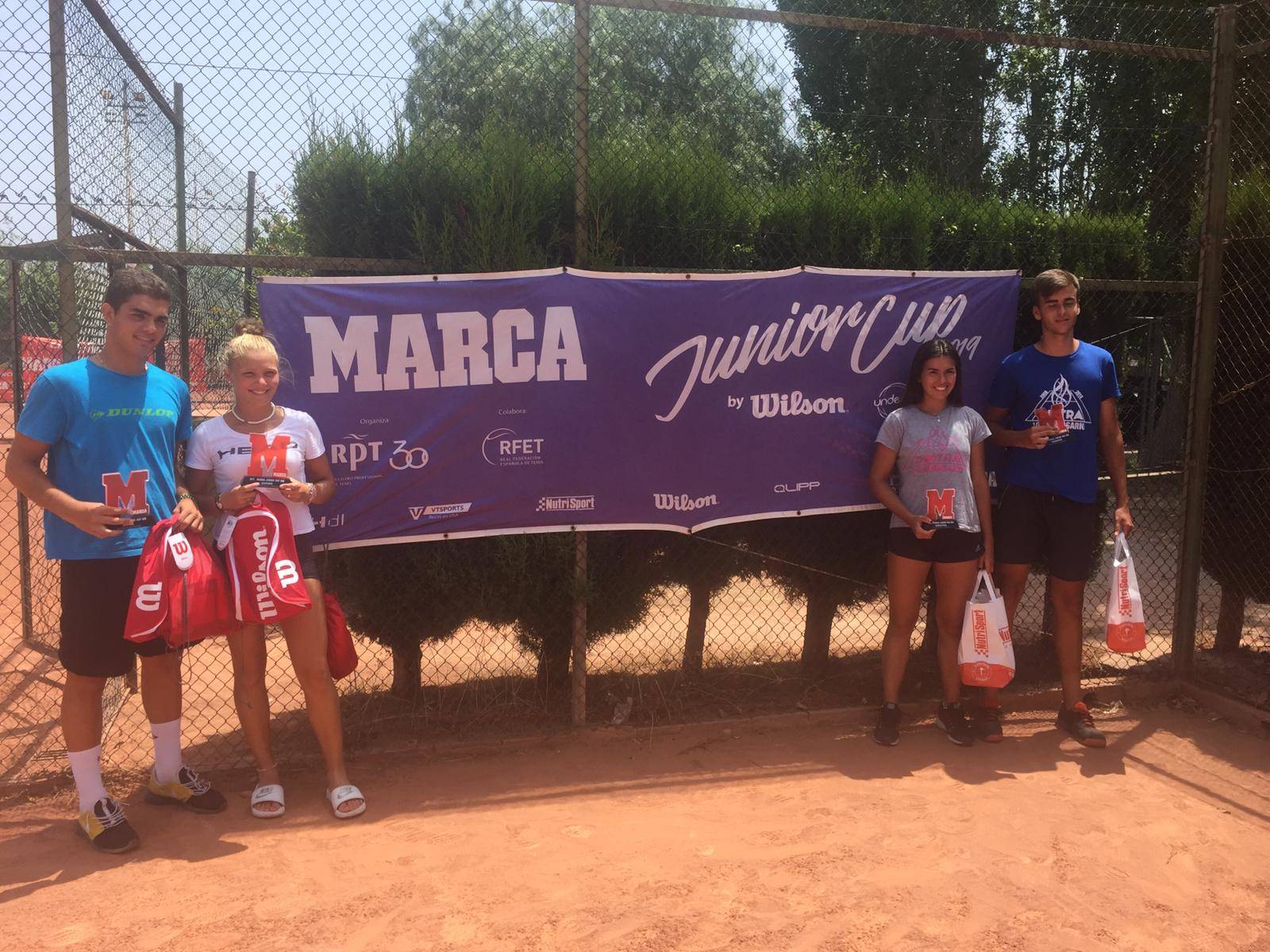 Los jugadores, Alejandro Salvador y Claudia Sánchez, finalistas del Circuito Marca Jóvenes Promesas by Wilson del C. T. Castellón, frente a Héctor Talens y Judith Perelló. ¡Enhorabuena!