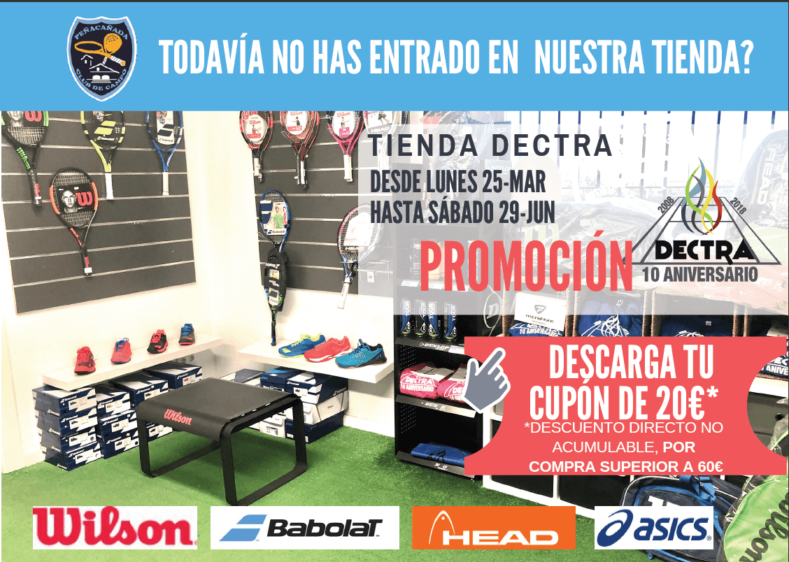 Con motivo del X Aniversario de la Escuela de tenis y pádel de Peñacañada, desde hoy, lunes 25 de marzo hasta el 29 de junio podréis beneficiaros de un cupón de 20 € en la tienda*. Para ello, se deberá presentar un cupón descargable que se puede conseguir haciendo clic AQUÍ.