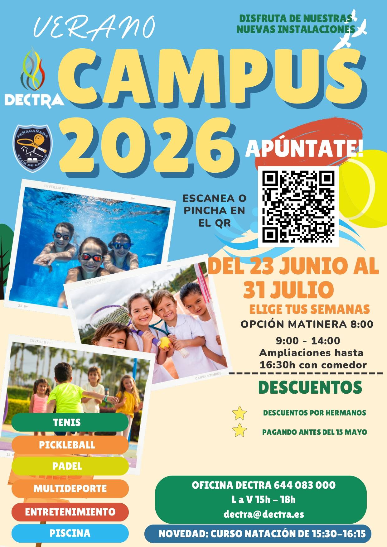📅 Del 23 de junio al 31 de julio, podrán practicar tenis, pádel, pickleball, multideporte y actividades de entretenimiento, además de disfrutar de la piscina. Como novedad, este año también se incorpora un curso de natación en horario de tarde.