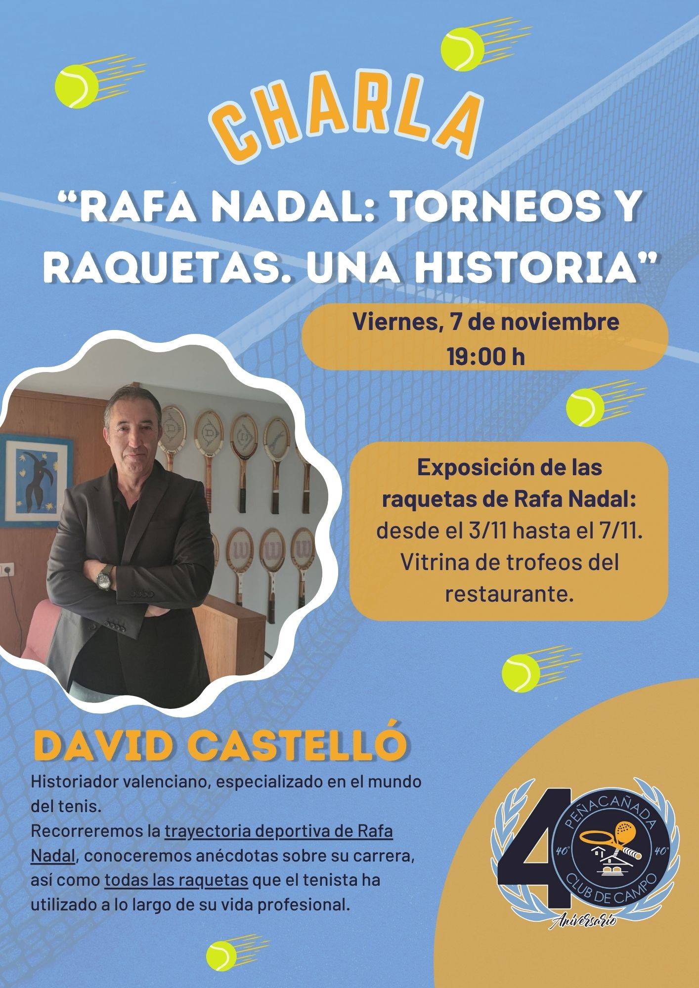 El viernes 7 de noviembre, a las 19:00 h, te invitamos a la charla «Rafa Nadal: torneos y raquetas. Una historia», a cargo de David Castelló, historiador valenciano especializado en tenis.