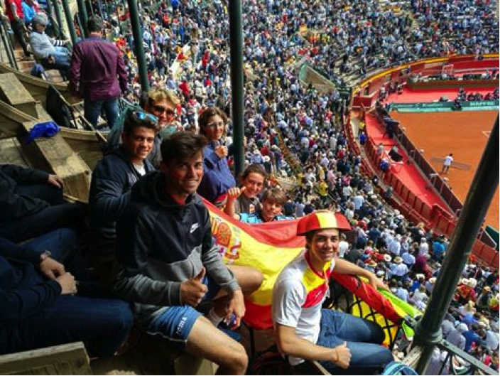 Presencia de muchos jugadores de Peñacañada en la Plaza de Toros de Valencia apoyando al Equipo Español de Copa Davis.